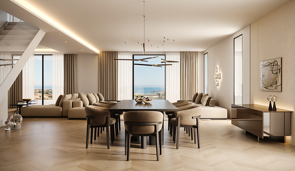On the first floor, there are three spacious en-suite bedrooms. The master suite stands out with a walk-in wardrobe, a luxurious bathroom, and direct access to a 30 m² private terrace offering breathtaking views across the golf course.